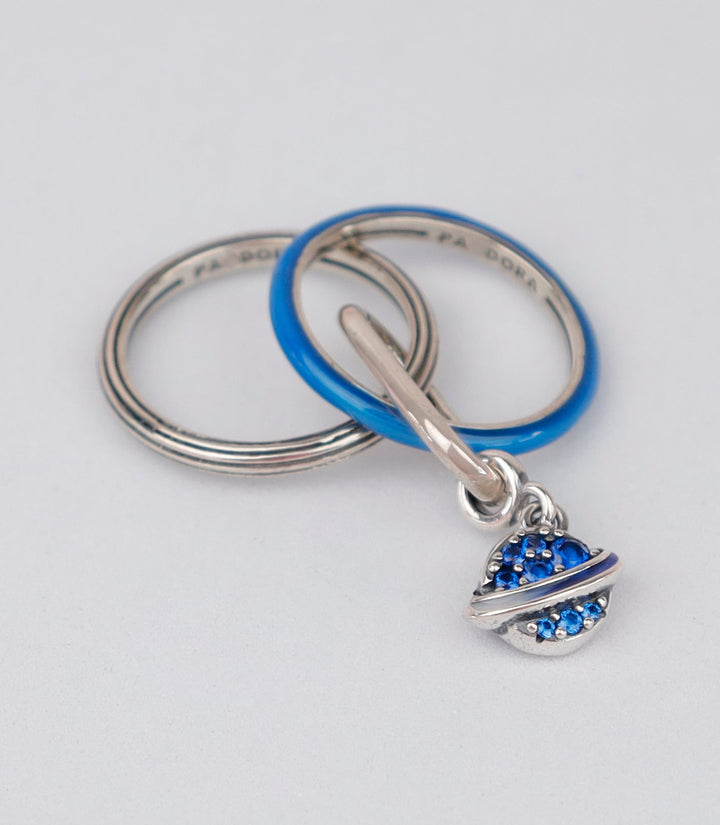 Anillo dual apilable en azul y Plata con conector con Mini Charm Planeta azul y circonitas AP14