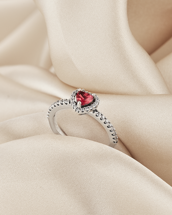 El centro del anillo está adornado con un cristal sintético rojo en forma de corazón y rodeado de circonitas pequeñitas transparentes bordeando el corazón y el anillo.