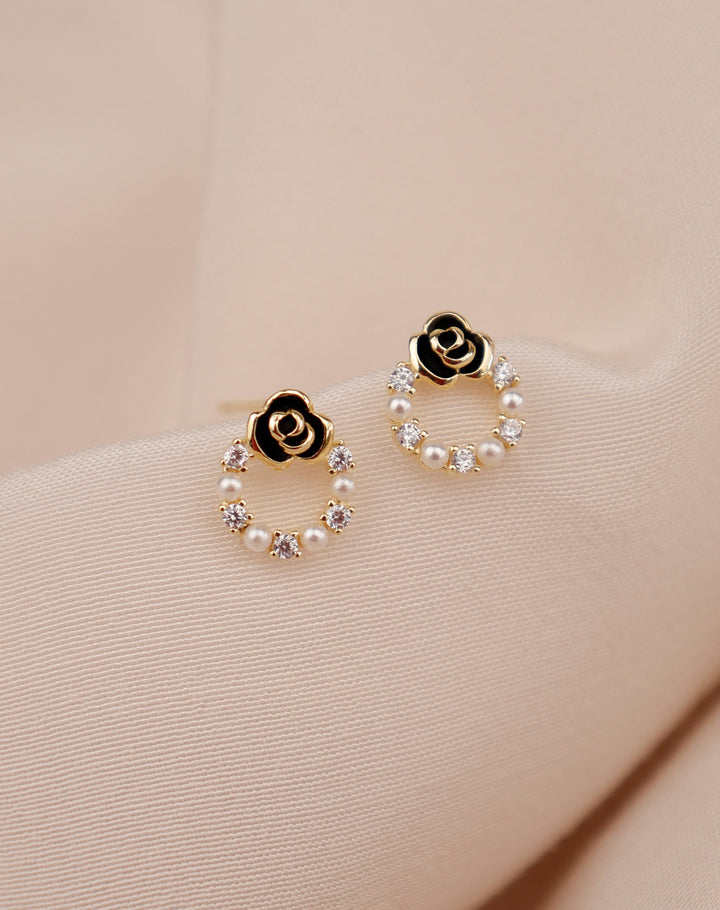 Arete en Plata 925 decorado con una rosa negra con bordes dorados en la parte superior y pequeñas perlas y circonitas transparentes
