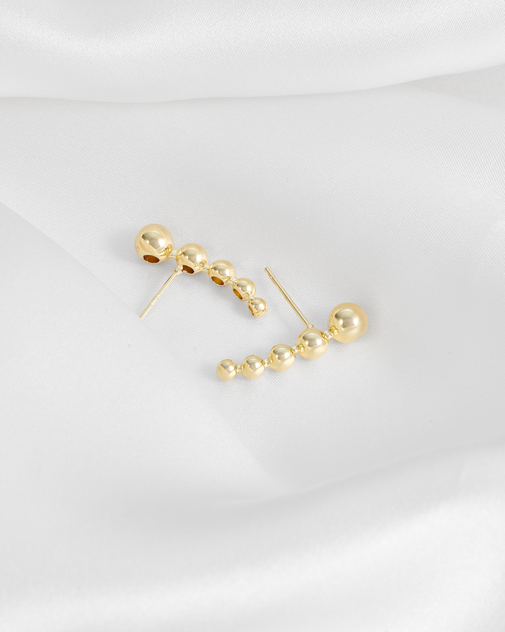 Aretes en plata con baño de oro, hipoalergénicos; tiene 5 balones en tamaños diferentes.