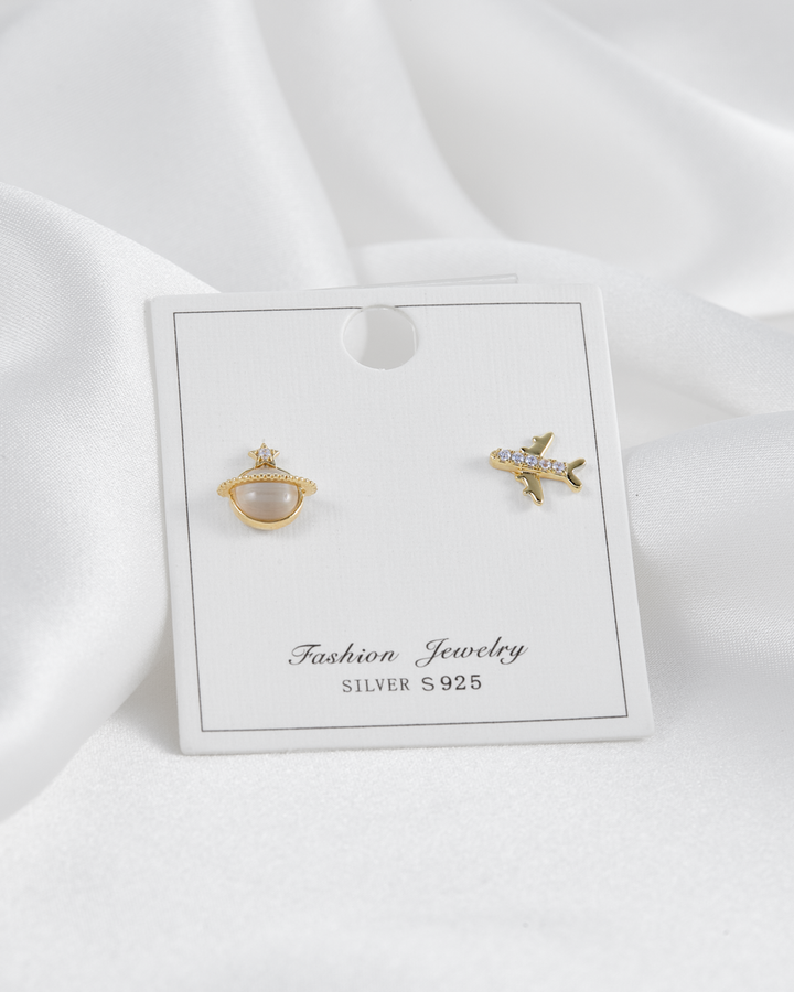 Aretes en plata con baño de oro, hipoalergénicos, avión recubierto en circonitas y planeta.