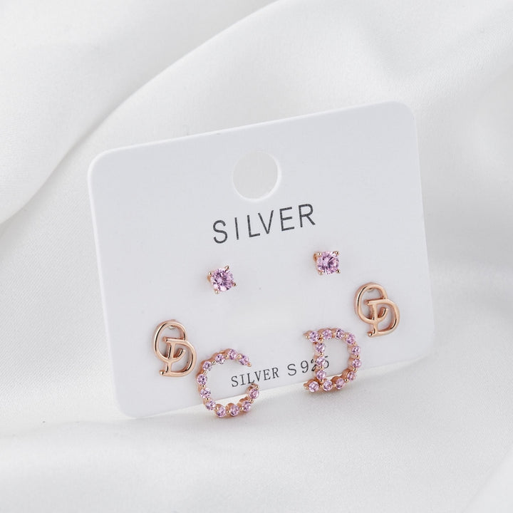 Aretes set x 3 en plata 925 con baño de rose gold, , hipoalergénicos, Huggies con letras CD y circonitas