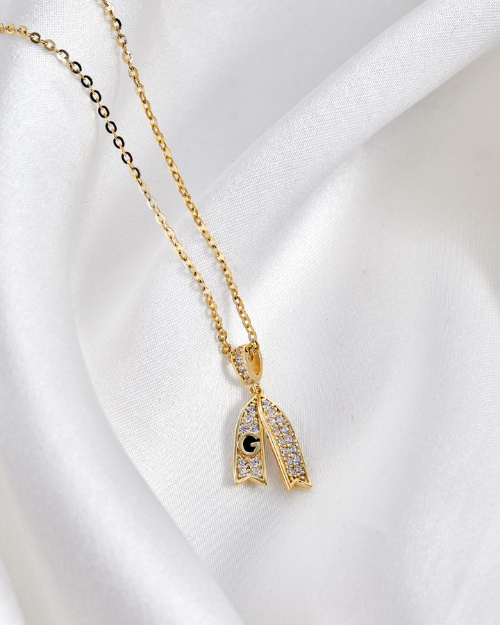 Cadena en plata con baño de oro, hipoalergénico; en forma de cintilla en circonitas con la letra G.