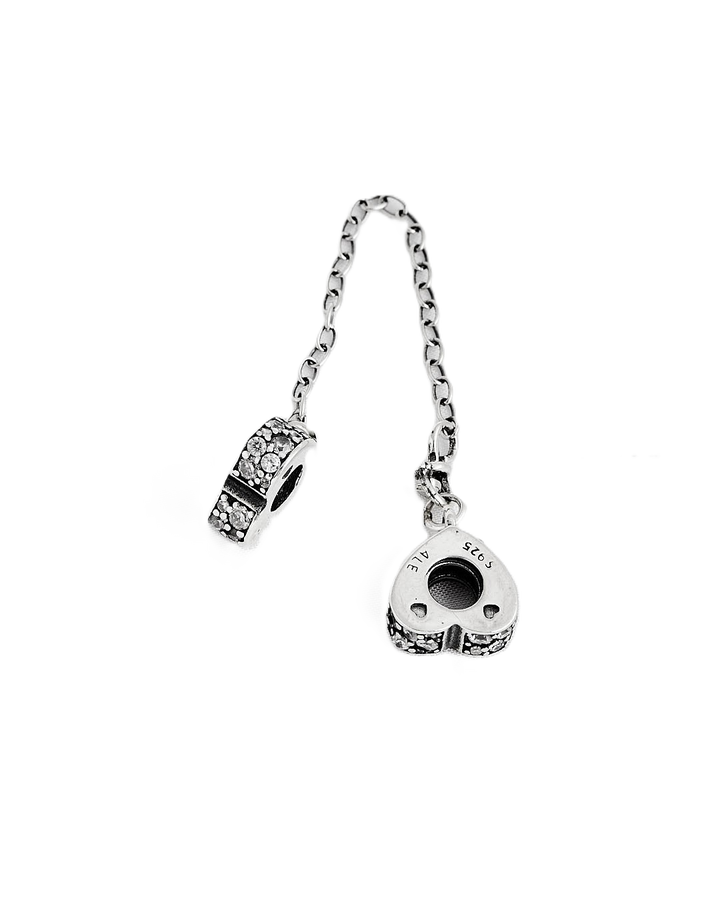 Seguro elaborado en plata 925 con extremos decorados: uno con forma de corazón calado y otro con diseño de aro adornado con detalles en relieve.