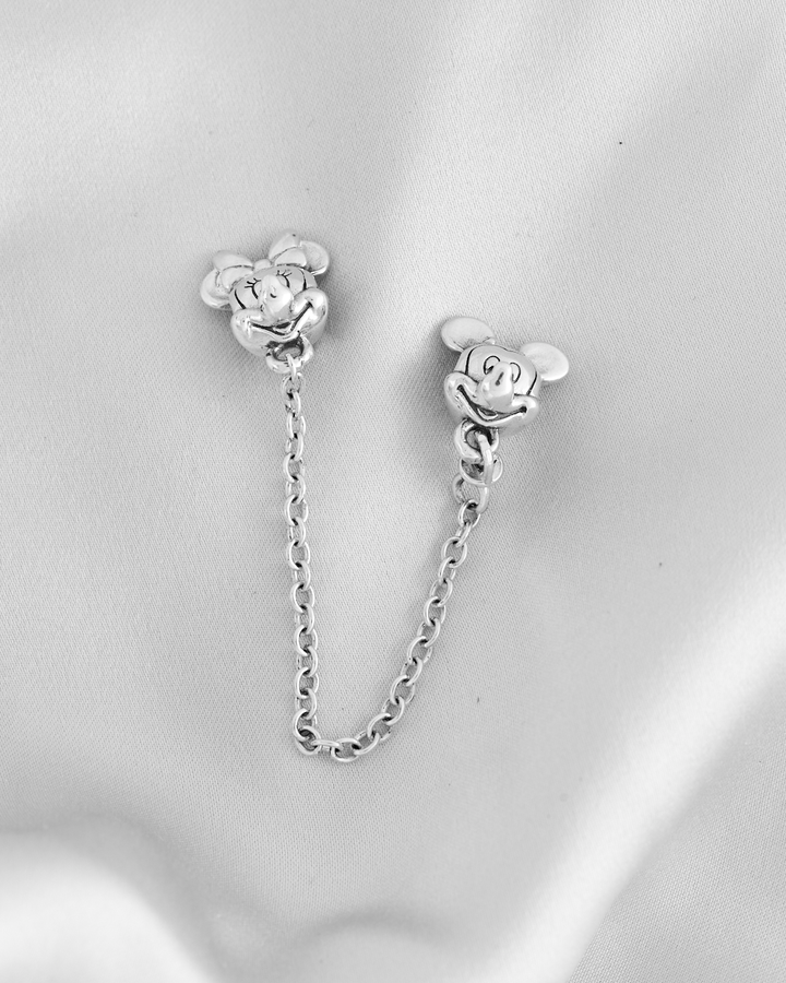 Seguro en plata 925 con terminales en forma de la icónica silueta de M!nnie y Mick3y. Un accesorio funcional y encantador que protege tu pulsera con un toque mágico y divertido.
