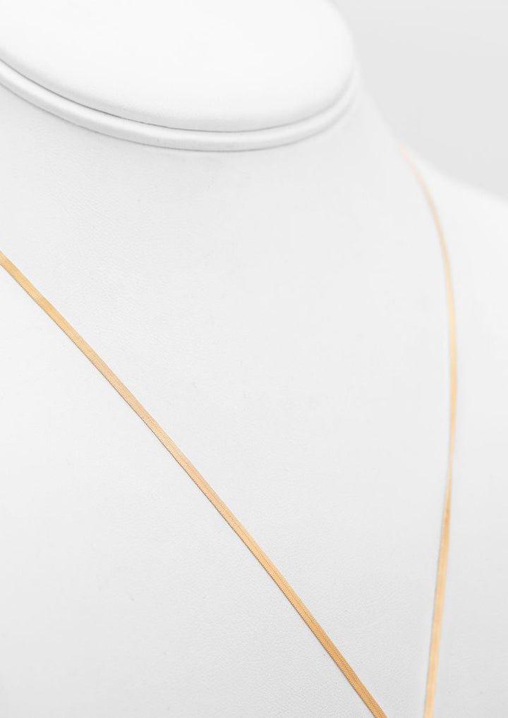 Cadena plana y delgada en tono dorado, ideal para usar sola o con dije. Su diseño minimalista le da un toque moderno y elegante.