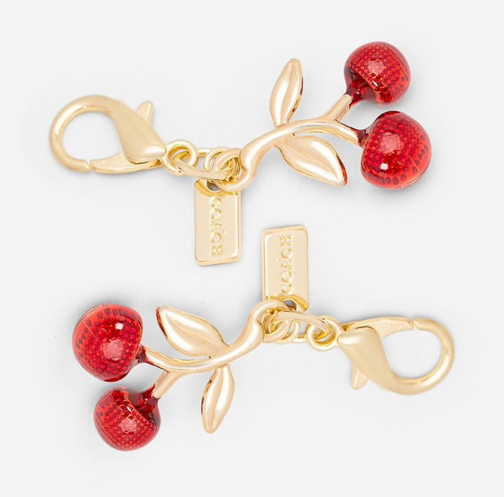 Llavero dorado con diseño de cerezas esmaltadas en rojo brillante. Un accesorio coqueto y vibrante para bolsos, llaves o mochilas.