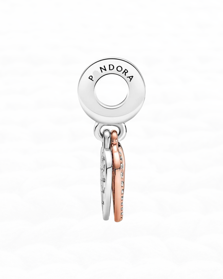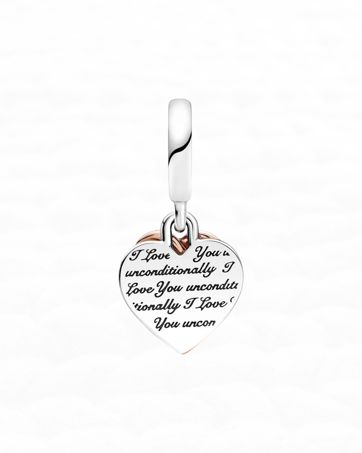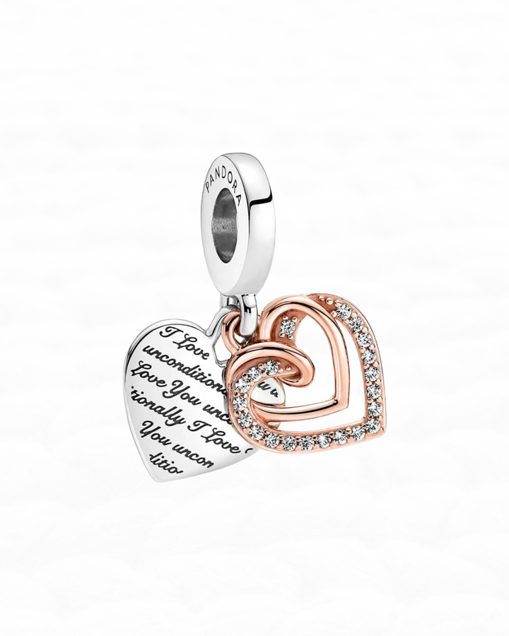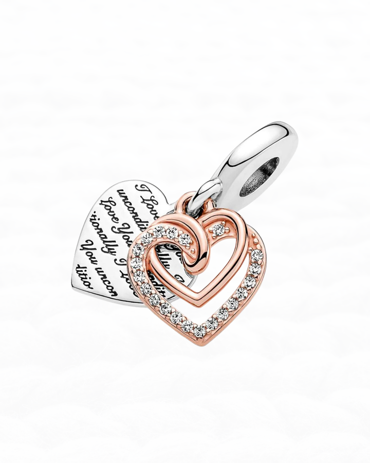 El dije Corazones Eternos es un colgante en plata 925 y baño en Gold Rose, compuesto por dos corazones entrelazados: uno decorado con micro circones y otro grabado con un mensaje de amor incondicional. Una pieza perfecta para simbolizar vínculos profundos y duraderos, ideal para regalar en ocasiones especiales.
