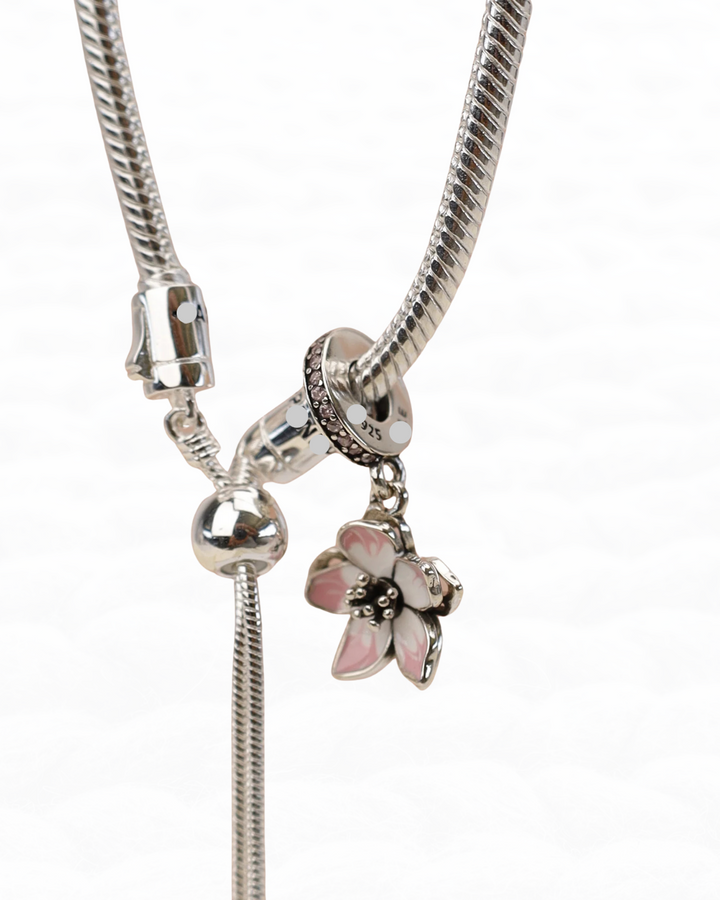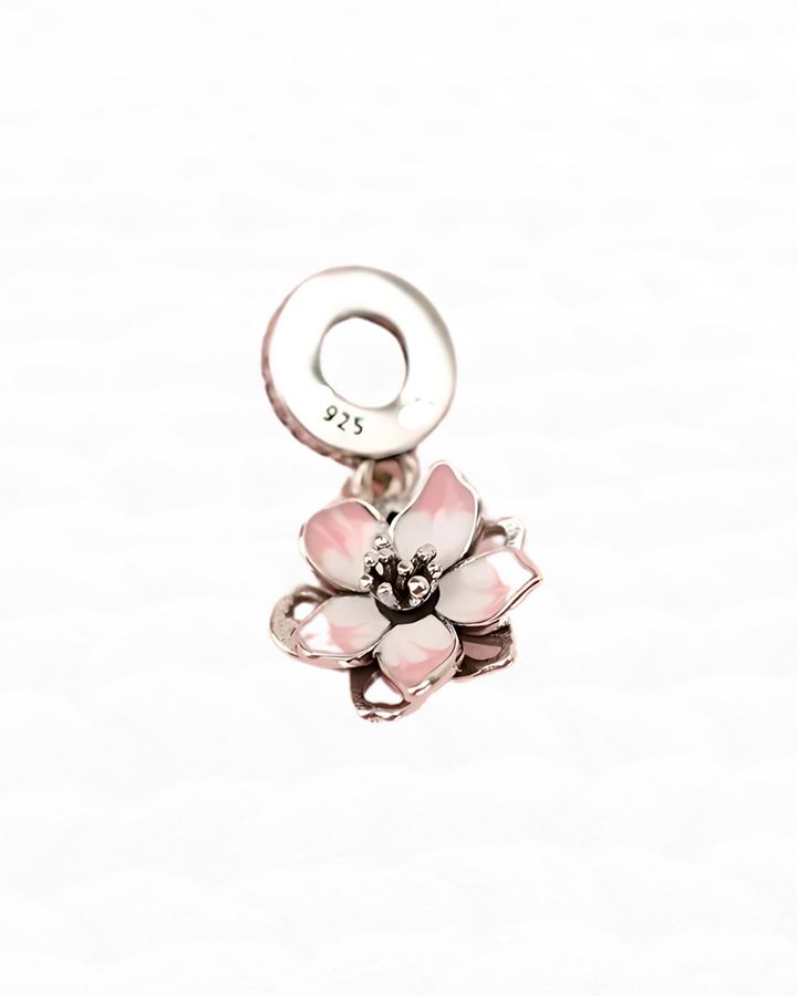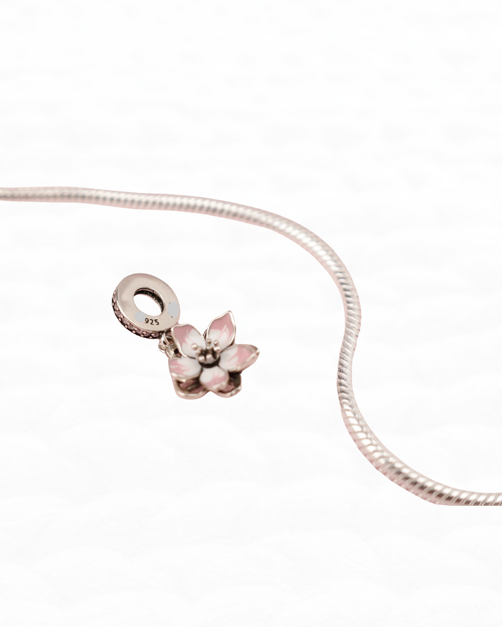 Este dije en Plata 925 presenta un diseño en forma de flor rosada, perfecto para complementar pulseras. Se ofrece sin opción de cambio ni garantía.
