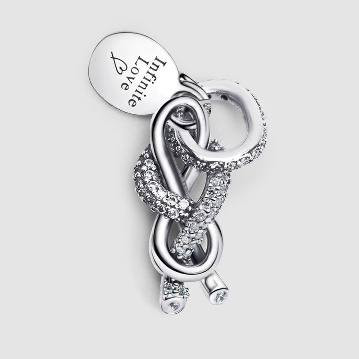 Este elegante Dije de plata 925 simboliza el amor eterno con un diseño entrelazado de símbolos infinitos adornados con circonitas brillantes. Incluye una medalla grabada con la frase “Infinite Love”, que le da un toque romántico y significativo.
