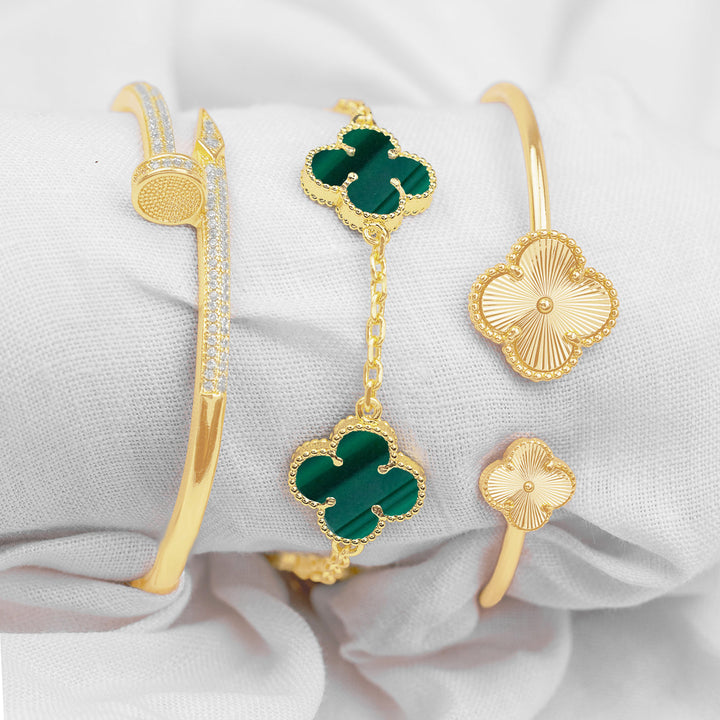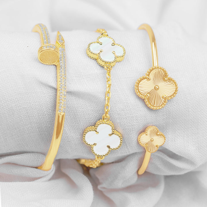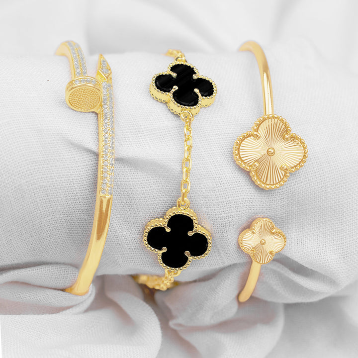 Trío de brazaletes dorados que fusionan elegancia y lujo en cada detalle. Incluye un brazalete tipo clavo con brillo sutil, un brazalete abierto con extremos en forma de trébol y uno completo de tréboles árabes interconectados.