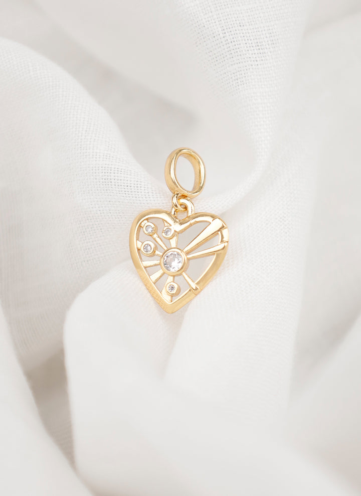Dije en forma de corazón con diseño calado y detalle central de circonita clara, elaborado con esmalte dorado. Su estilo delicado y elegante lo convierte en un accesorio versátil para complementar cadenas o pulseras.
