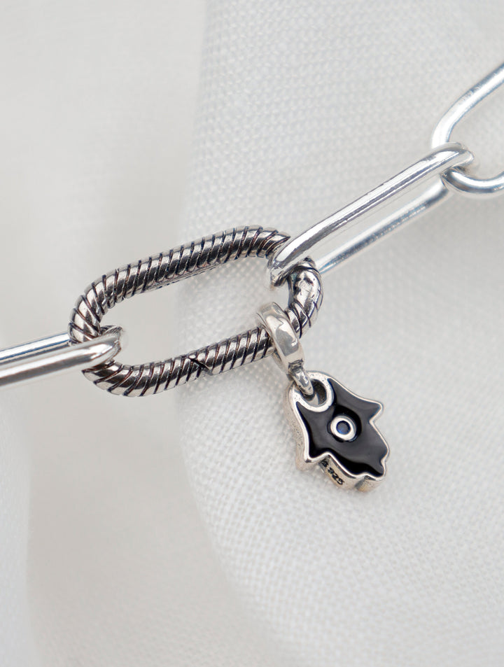 Mini Dije en forma de mano de Fátima elaborado en plata 925, con esmalte negro y detalle central de ojo protector en miniatura. Un amuleto tradicional que simboliza protección, fuerza y buena suerte.