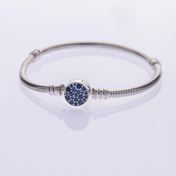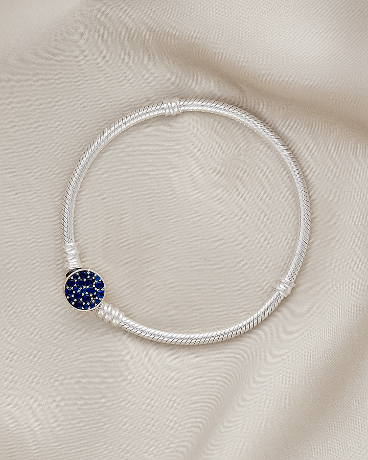 Recomendación: Hermosa pulsera de plata con un cierre circular con un disco azul brillante en su interior.