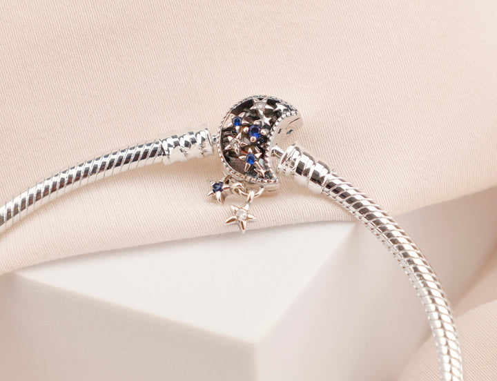 Pulsera con cierre en forma de estrellas y luna creciente con circonitas transparentes y azules.