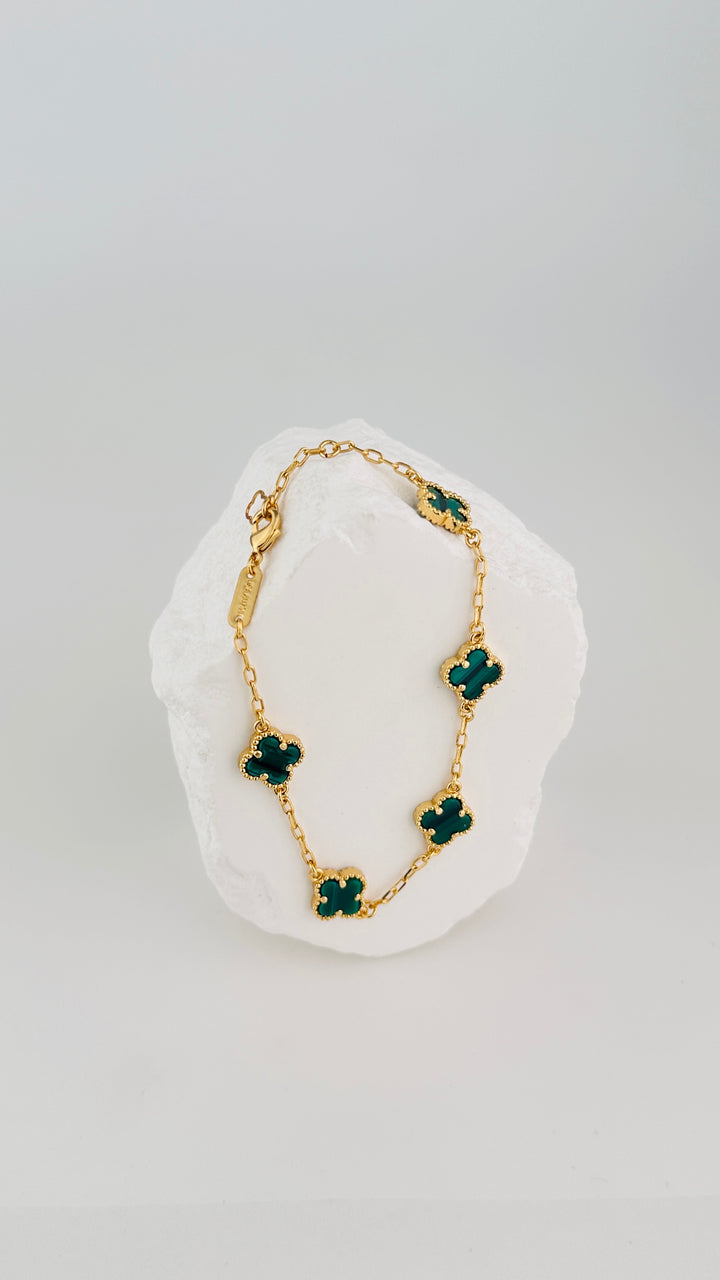Pulsera en oro laminado con tréboles, ajustable de la talla 16 a la 20, El tamaño del trébol es de 11 milímetros aproximadamente