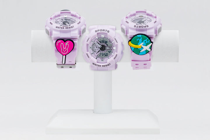 Reloj lila gira bad bunny 2025... Relojes Sport con estilo deportivo vienen decorados con dijes. Con diseño resistente, correa ajustable y colores llamativos, son perfectos para actividades deportivas