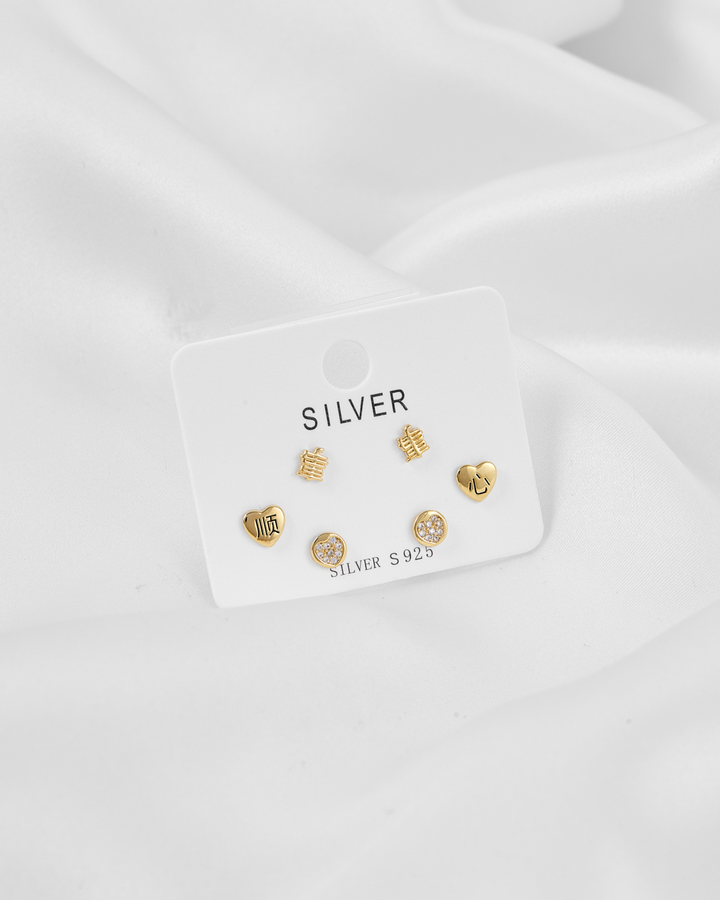 Set aretes x 3 en plata con baño de oro, hipoalergénicos, corazon y circulo.