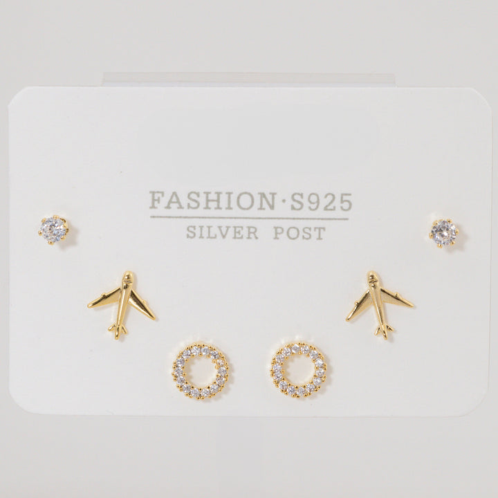 Set de aretes por 3 dormilona con circonitas en oro laminado en forma de avion