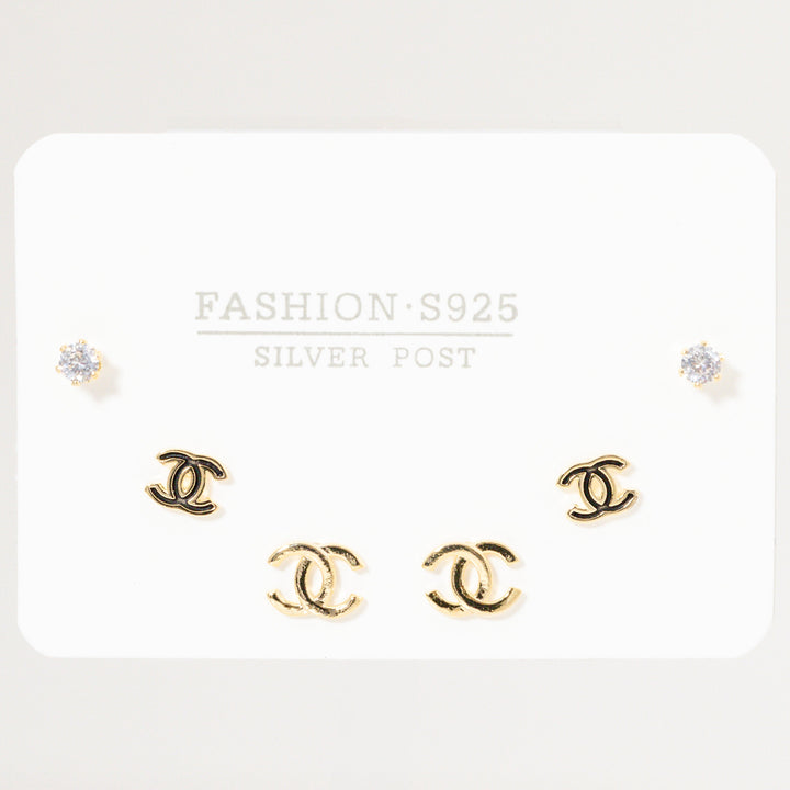Set de aretes por 3 dormilona con circonitas en oro laminado en forma de CC y una invertida