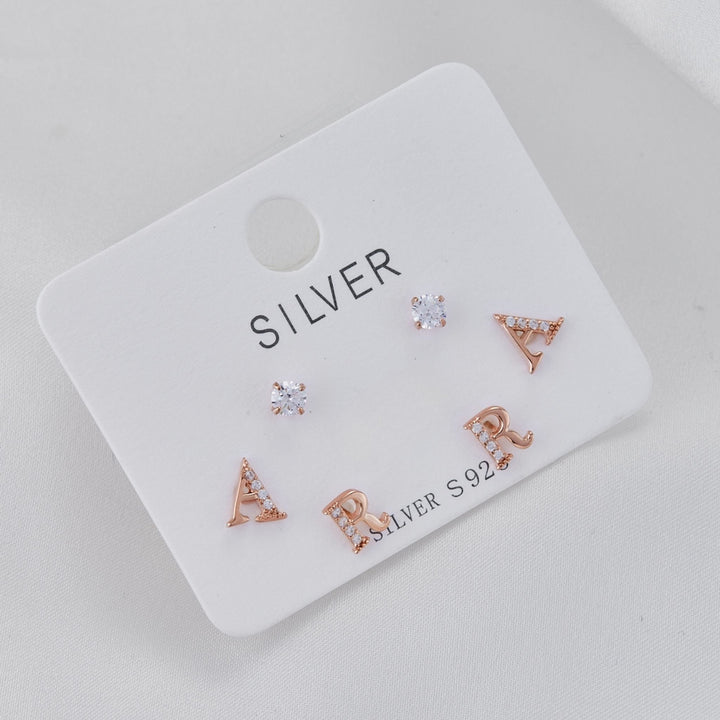 Set aretes x 3 en plata 925 con baño de Gold rose hipoalergénico, letras A R y circonitas Gold rose
