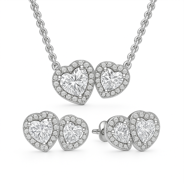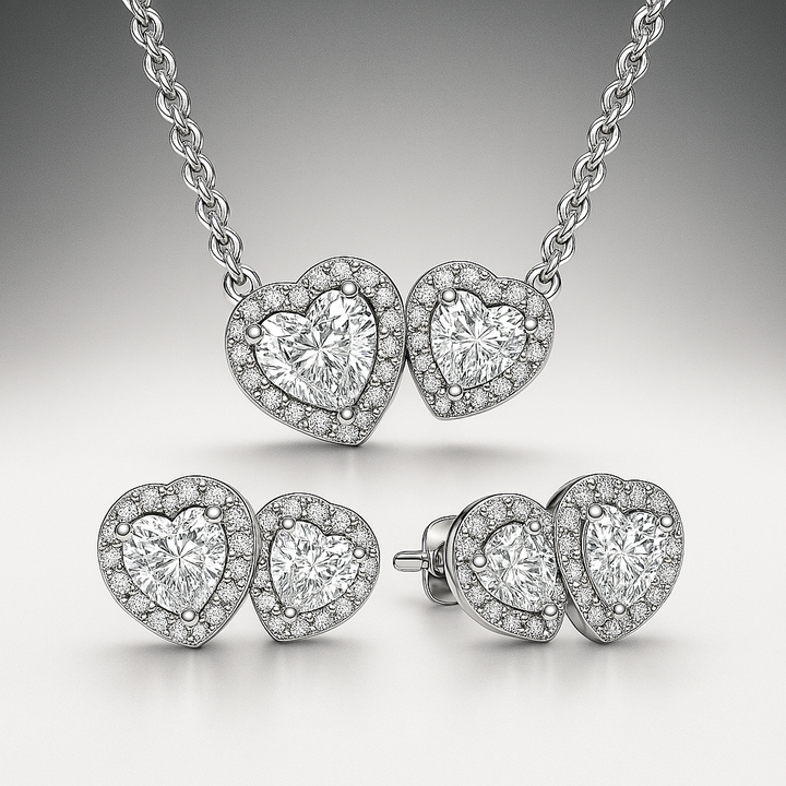 Este conjunto de joyas es una declaración de amor y elegancia. Diseñado con delicados corazones en plata, cada pieza combina cristales transparentes que reflejan romanticismo. El colgante presenta dos corazones entrelazados, mientras que los aretes complementan el diseño con un corazón central rodeado de brillo.