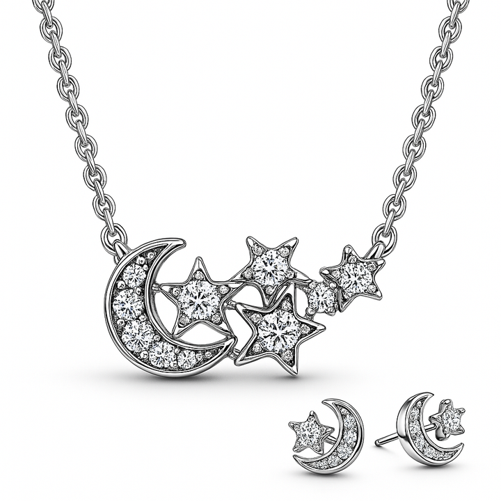 Set Cadena y Aretes en plata Ale 925 con dos Lunas en los aretes y una luna en la cadena , circonitas transparente