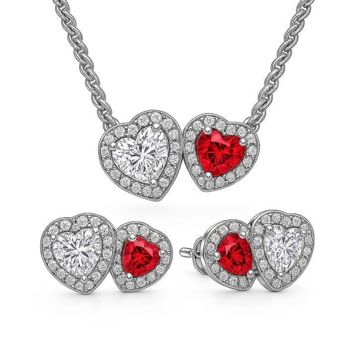 Este conjunto de joyas es una declaración de amor y elegancia. Diseñado con delicados corazones en plata, cada pieza combina cristales blancos y rojos que reflejan pasión y romanticismo. El colgante presenta dos corazones entrelazados, mientras que los aretes complementan el diseño con un corazón central rodeado de brillo.