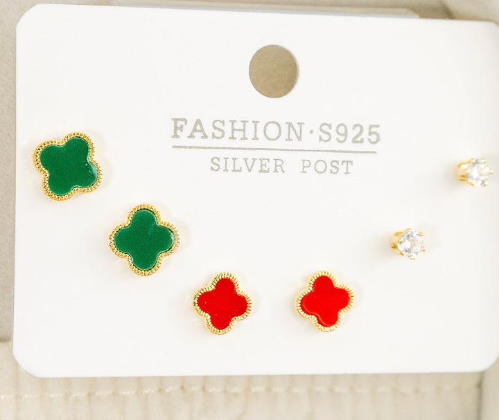 Set de aretes por 3 con circonitas en oro laminado en forma de trebol verde y rojo