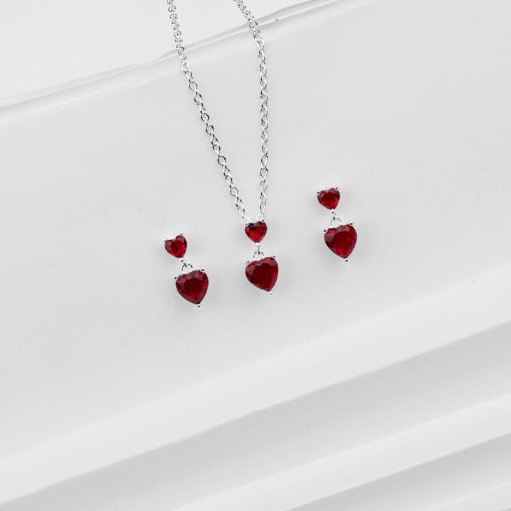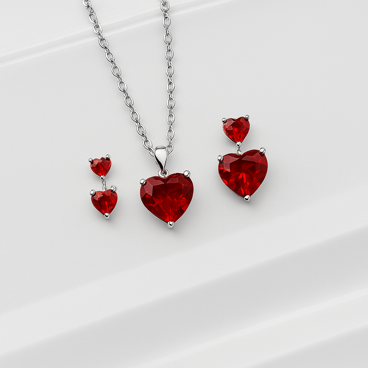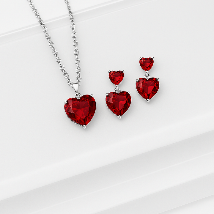 Añade un toque de pasión y elegancia a tu look con este hermoso set de collar y aretes, en plata, diseñado con piedras en forma de corazón en un intenso tono rojo rubí.