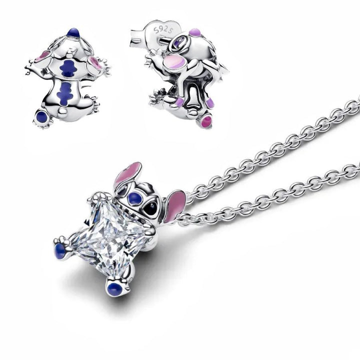 Set de joyería inspirado en St1tch, elaborado en plata 925. Incluye cadena con dije de cristal brillante y aretes con esmalte en tonos rosado, azul y lila. Perfecto para regalar o lucir un look tierno y original. La cadena mide 45cm de largo. No tiene cambio ni garantía
