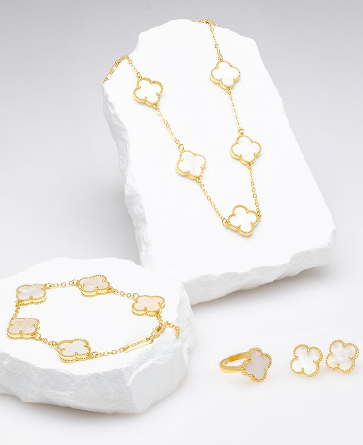 Set de Collar, Pulsera, Aretes y Anillo Trebol Blanco Nacar VCAP09