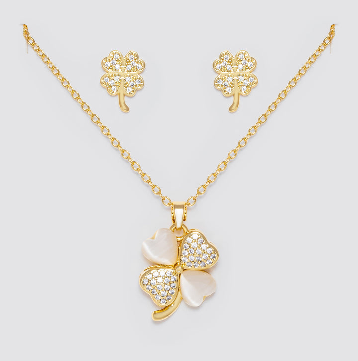 Conjunto dorado con trébol de cuatro hojas decorado con circonias y detalles en nácar. Incluye collar y aretes. Un símbolo de buena fortuna con brillo delicado.