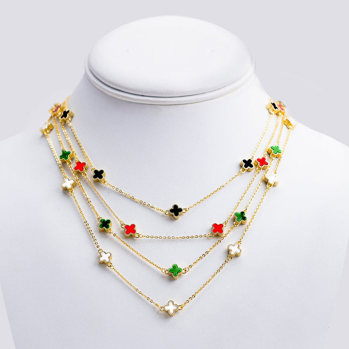 Cadenas doradas con dijes en forma de trébol de cuatro hojas, disponibles en una vibrante combinación de colores: Blanca, Negra, Roja y verde