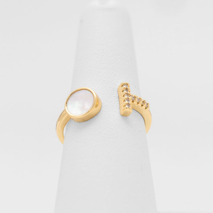 Anillo ajustable con diseño abierto. Un extremo con perla nácar y el otro con detalles de circonias. Moderno, delicado y elegante.