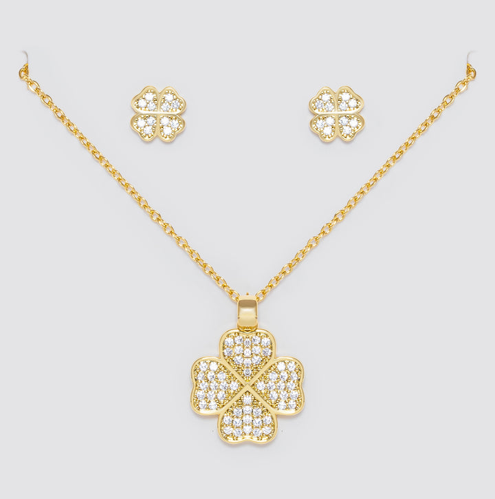 Set dorado con diseño de trébol de cuatro hojas cubierto de circonias brillantes. Incluye collar y aretes. Un detalle encantador para atraer buena suerte.
