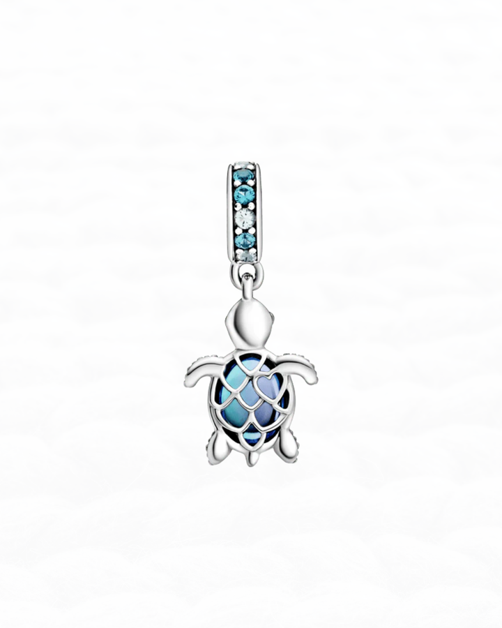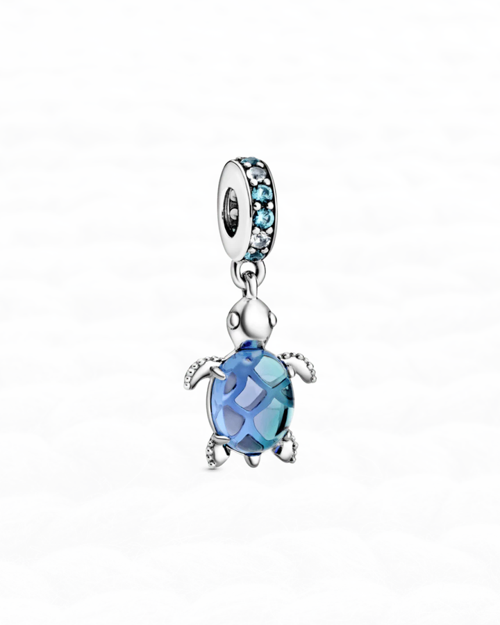 El dije Tortuga de mar de cristal Murano inspirado en las criaturas habitantes en el mar azul. Tiene cristales azul agua decolorados, cristales verde hielo y una sola cuenta de cristal Murano en azul pavo real. En el vientre de la tortuga hay un corazón que brilla a través del cristal Murano para crear un precioso efecto degradado que brilla con la luz.